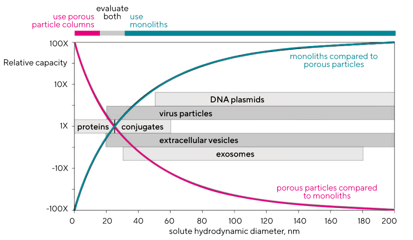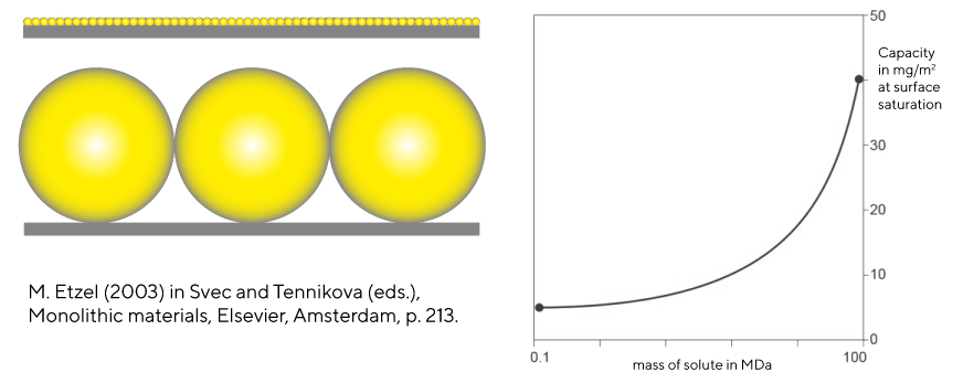 Monoliths also support higher capacity in mass per unit of surface area because solute mass increases more as a function of its three-dimensional size than as a function of the surface area it occupies (Image 2). Porous particle columns cannot benefit from this relationship because the slower diffusion constants of larger solutes progressively restrict them from achieving surface saturation. Monoliths therefrom, offer optimal solution for large biomolecules as they (relatively) offer largest capacities for the largest of the commercially interesting biomolecules (Image 3).