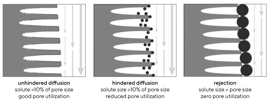 Hindered diffusion is another major piece of the puzzle in porous particle media inefficiency. It refers to a situation in which obstacles interfere with the random movement of solutes, in this case the pore walls. It compounds the fundamental inefficiency of diffusive mass transport. Monoliths support higher capacity for large solutes because access to the binding surface is not hindered.