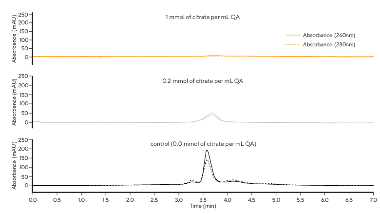 Changes in the chromatographic profile become evident even at low concentrations of citric ions present in the loading sample. At higher concentrations of citric ions, a decrease in the peak heights and peak areas of AAV elution peaks, along with lower sample recovery, is observed: