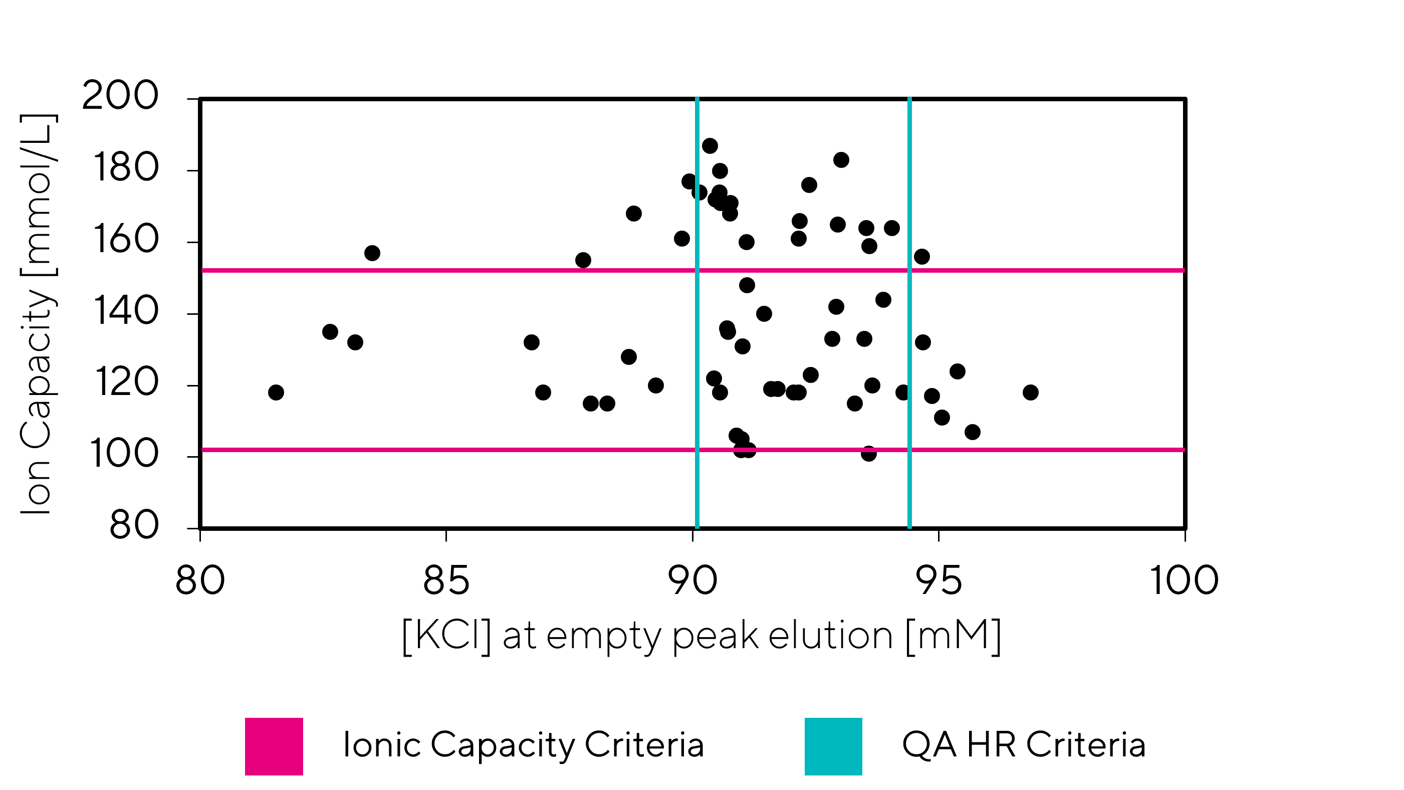 Testing and comparing several CIMmultus QA and CIMmultus QA HR columns has proven that there is no correlation between the tests for release criteria described in the previous paragraph. A representative graph of the release criteria is shown on Figure 1, where each dot represents the results of an individual column.