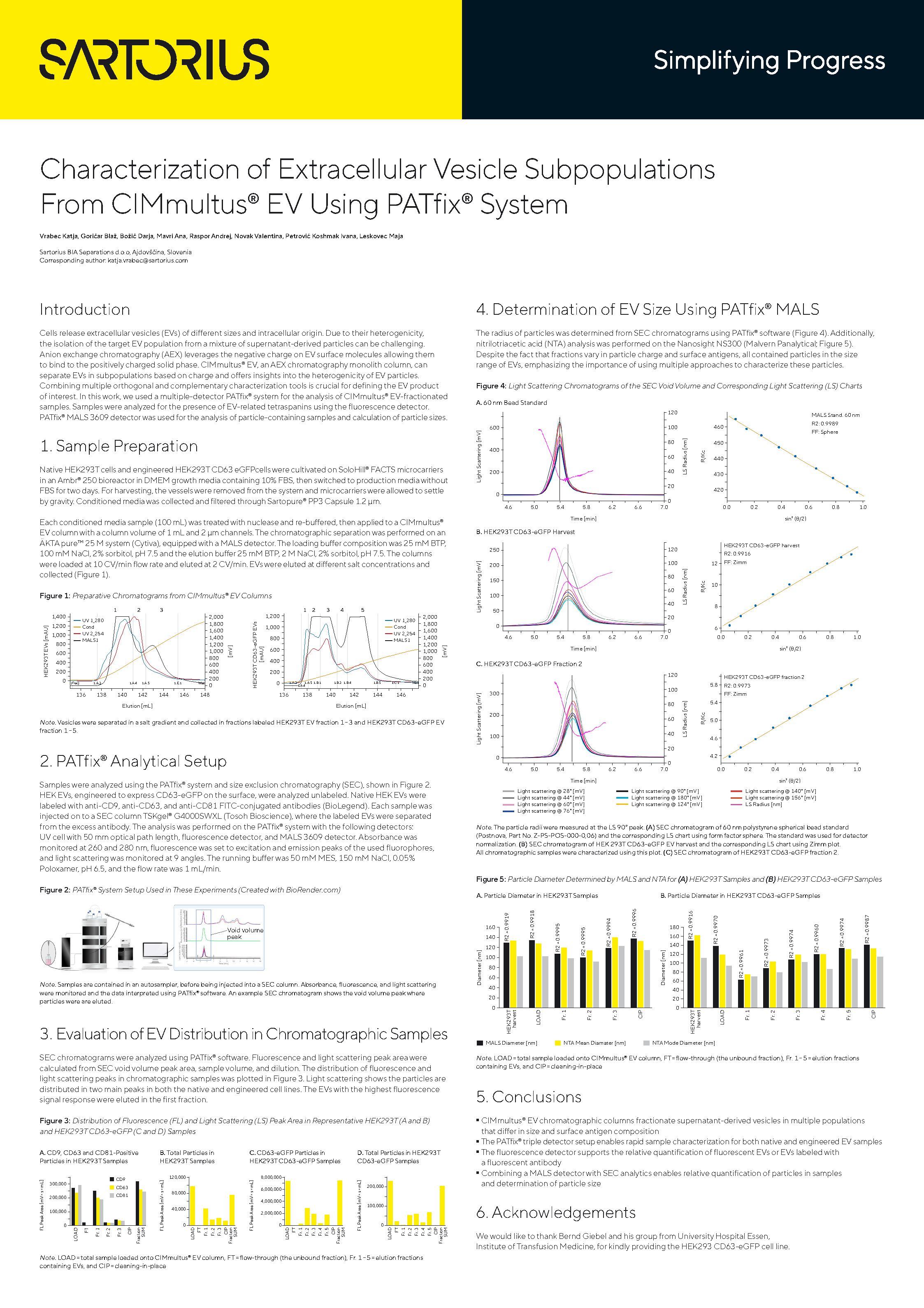 In this work, we used a multiple-detector PATfix system for the analysis of CIMmultus EV-fractionated samples. Samples were analyzed for the presence of EV-related tetraspanins using the fluorescence detector. PATfix MALS 3609 detector was used for the analysis of particle-containing samples and calculation of particle sizes.