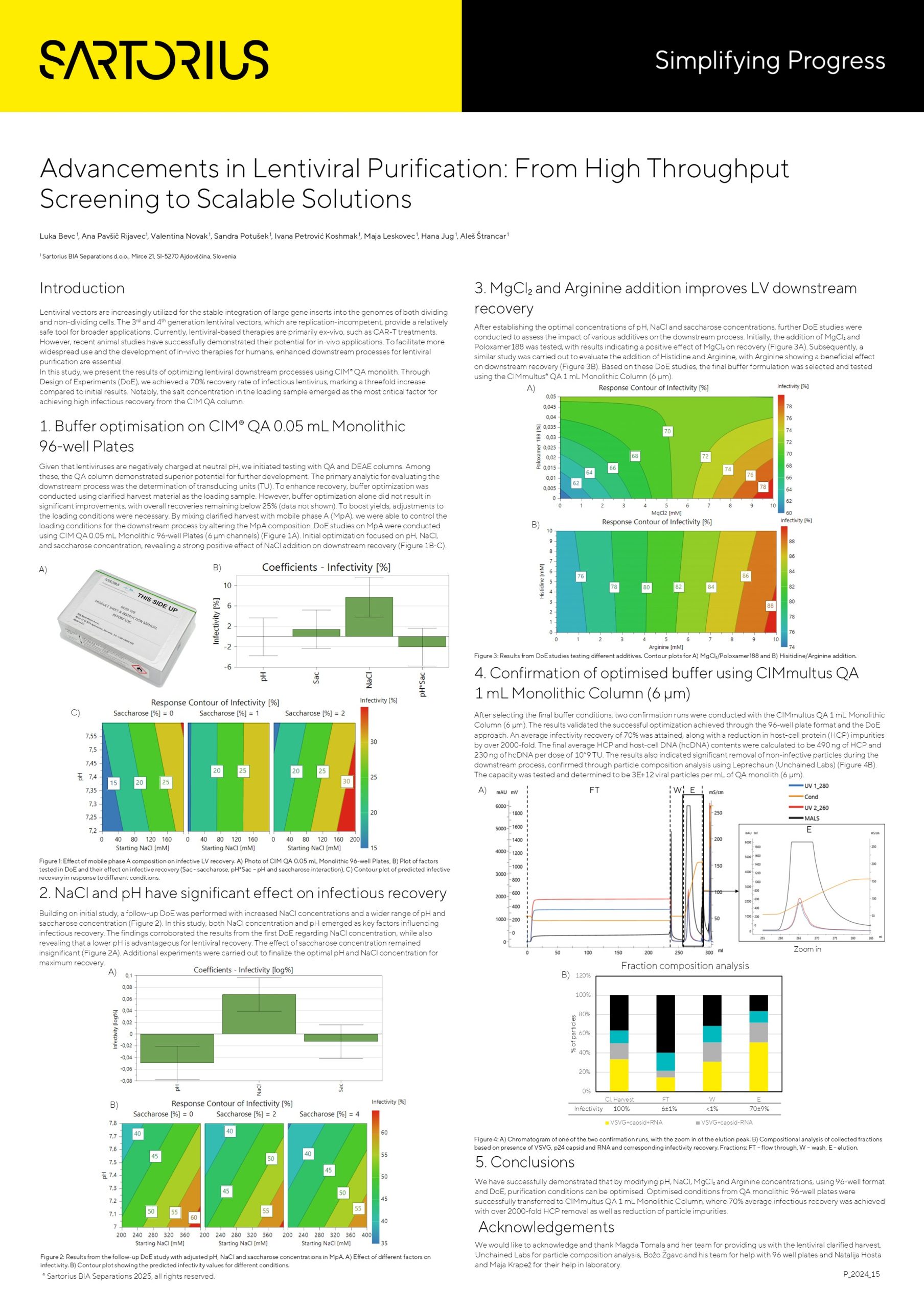 In this work, we present the results of lentiviral downstream optimisation on CIM® QA monolith with the use of DoE. Using DoE, we successfully increased infectious lentiviral recovery to 70%, a 3x increase, compared to initial results. Interestingly, salt concentration in loading sample was determined as the most important factor for high infectious recovery of lentivirus from CIM QA column.