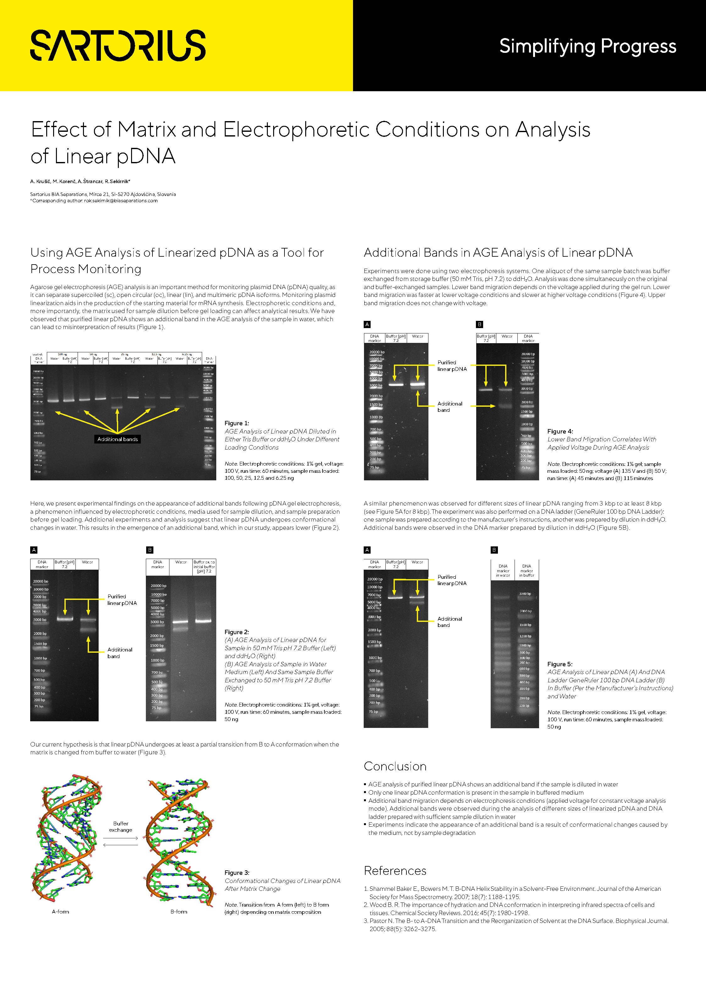 Agarose gel electrophoresis (AGE) analysis is an important method for monitoring of plasmid DNA (pDNA) quality, with ability to separate pDNA isoforms (sc, oc, lin, multimer). Plasmid linearization can be monitored for purposes of producing starting material for mRNA production. Electrophoretic conditions and, more importantly, matrix used for sample dilution before gel loading can affect analytical results. We have observed that purified linear pDNA shows an additional band in AGE analysis of the sample in water medium, which can lead to misinterpretation of results.