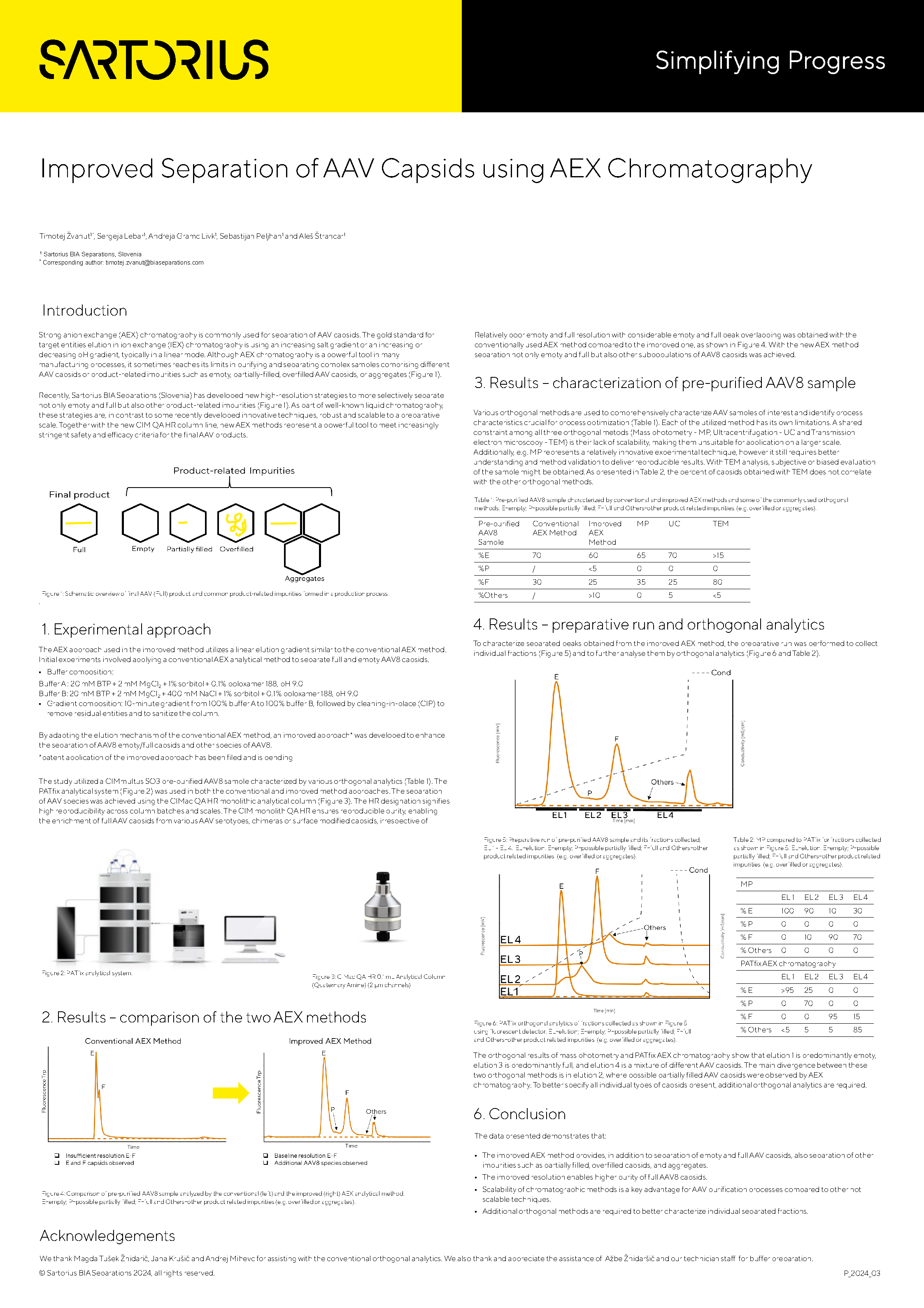 Recently, BIA Separations, Inc. (Slovenia) has developed new high-resolution strategies to more selectively separate not only empty and full but also other product related impurities. As part of well known liquid chromatography, these strategies are, in contrast to some recently developed innovative techniques, robust and scalable to a preparative scale. Together with the new CIM QA HR column line, new AEX methods represent a powerful tool to meet increasingly stringent safety and efficacy criteria for the final AAV products.