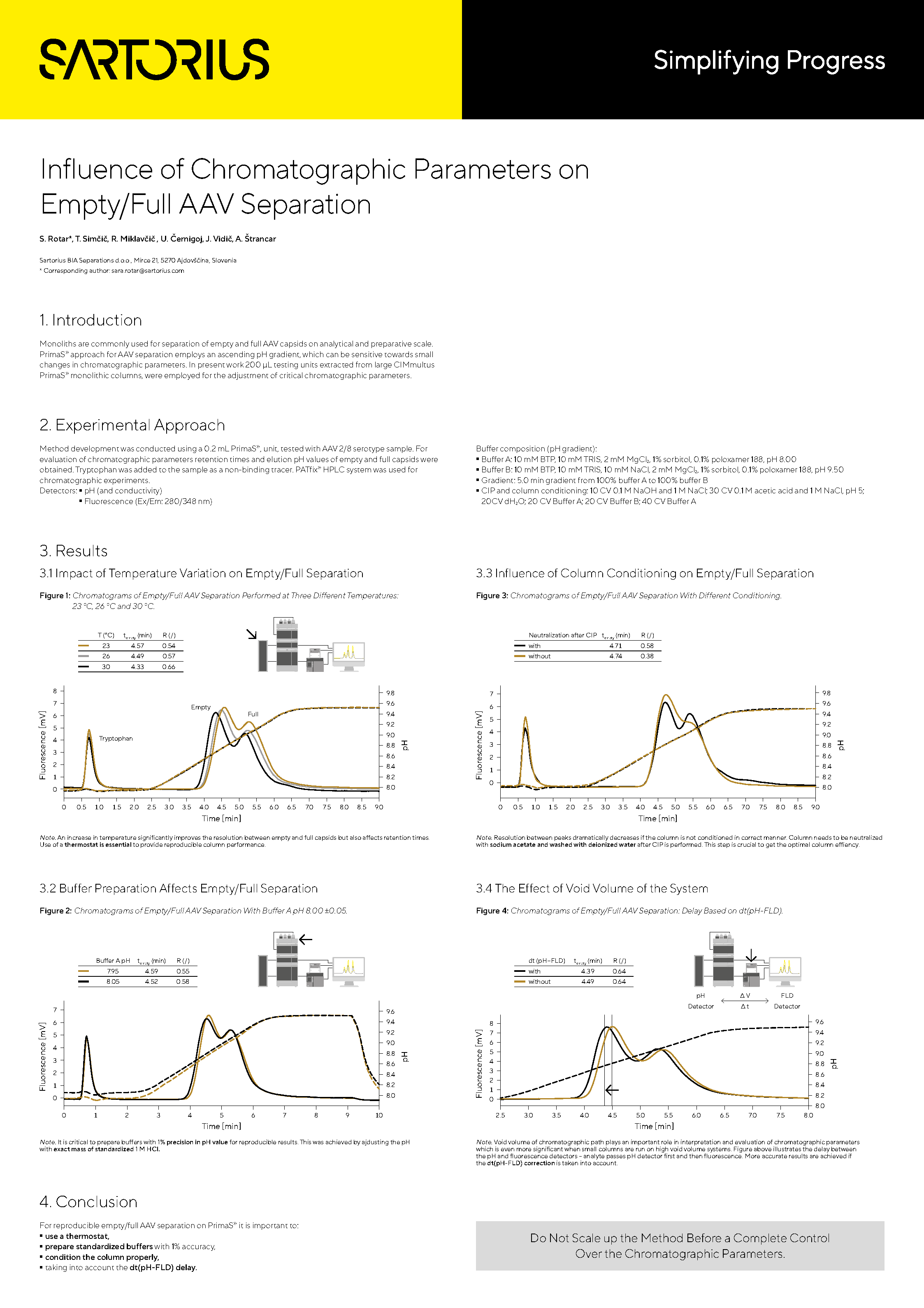 Monoliths are commonly used for separation of empty and full AAV capsids on analytical and preparative scale. PrimaS approach for AAV separation employs an ascending pH gradient, which can be sensitive towards small changes in chromatographic parameters. In present work 200 µL testing units extracted from large CIMmultus PrimaS monolithic columns, were employed for the adjustment of critical chromatographic parameters.