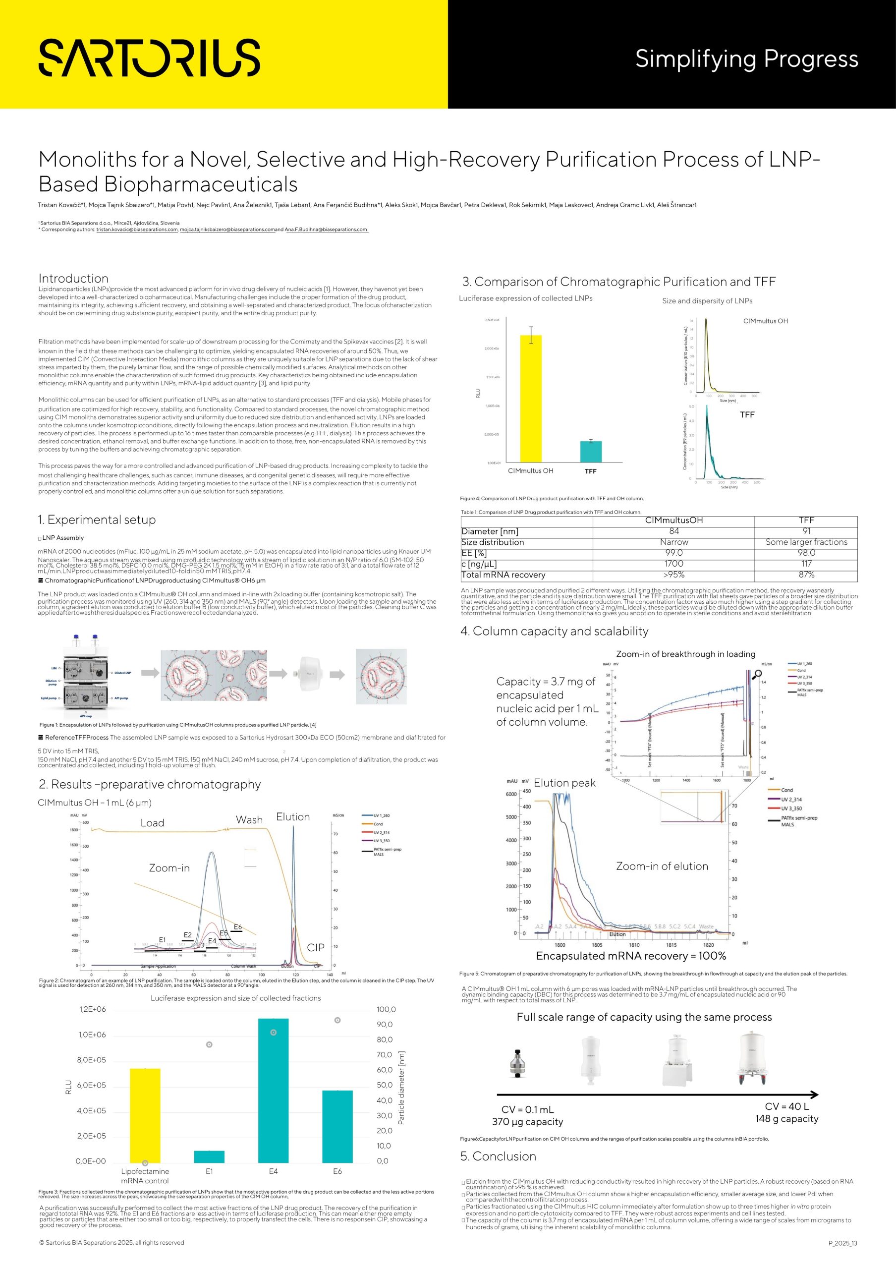 CIMmultus OH monolithic columns can be utilized as a chromatographic solution to purify LNPs. This process is used as a direct alternative to existing processes like TFF or dialysis, but is optimized to achieve additional benefits. These columns play a crucial role in refining separation processes, offering high recovery and enhanced particle quality. The study demonstrates that CIMmultus OH columns achieve superior encapsulation efficiency and particle uniformity compared to traditional methods.