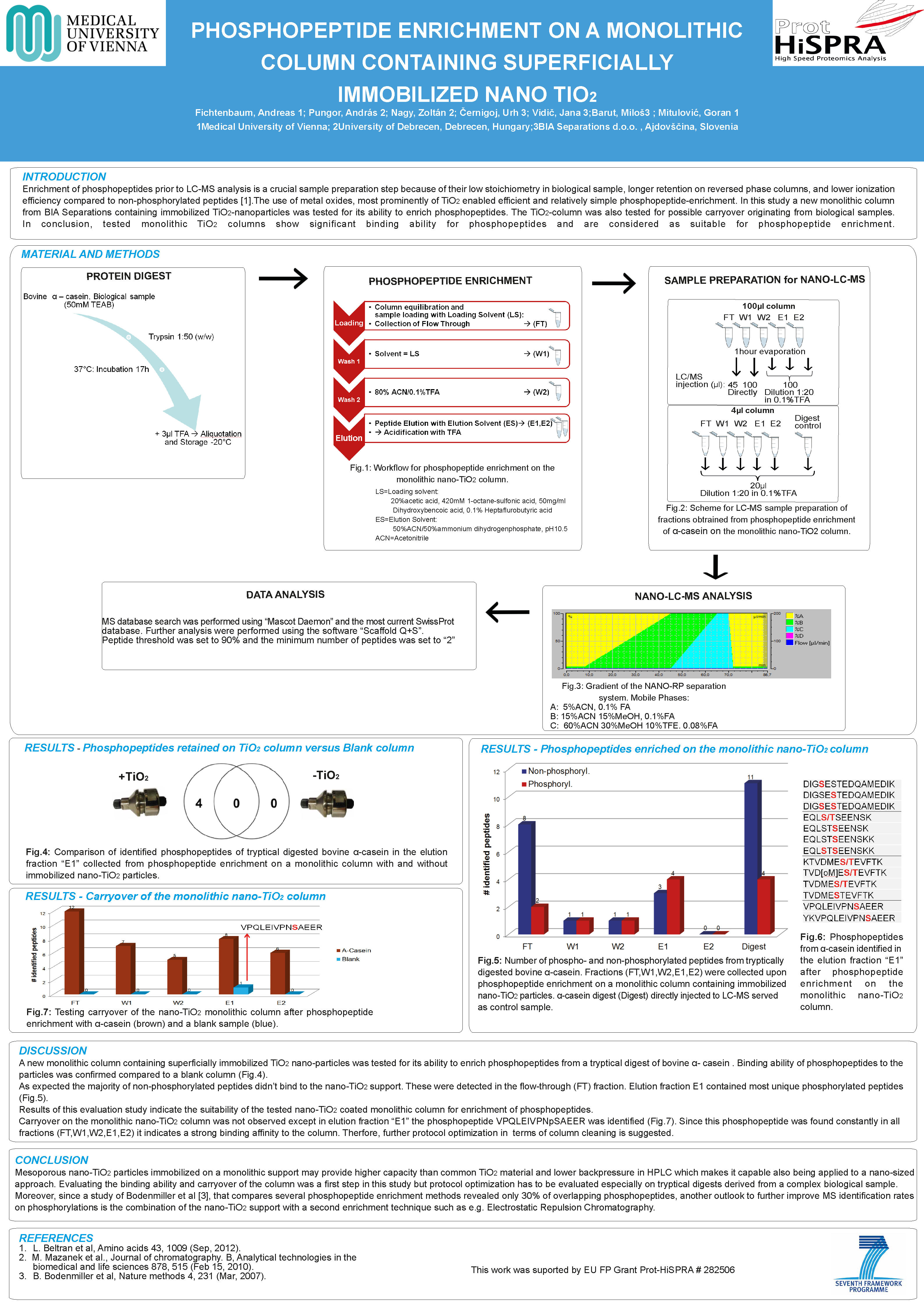 Enrichment of phosphopeptides prior to LC-MS analysis is a crucial sample preparation step because of their low stoichiometry in biological sample, longer retention on reversed phase columns, and lower ionization efficiency compared to non-phosphorylated peptides. The use of metal oxides, most prominently of TiO2 enabled efficient and relatively simple phosphopeptide-enrichment. In this study a new monolithic column from BIA Separations containing immobilized TiO2-nanoparticles was tested for its ability to enrich phosphopeptides. The TiO2-column was also tested for possible carryover originating from biological samples. In conclusion, tested monolithic TiO2 columns show significant binding ability for phosphopeptides and are considered as suitable for phosphopeptide enrichment.