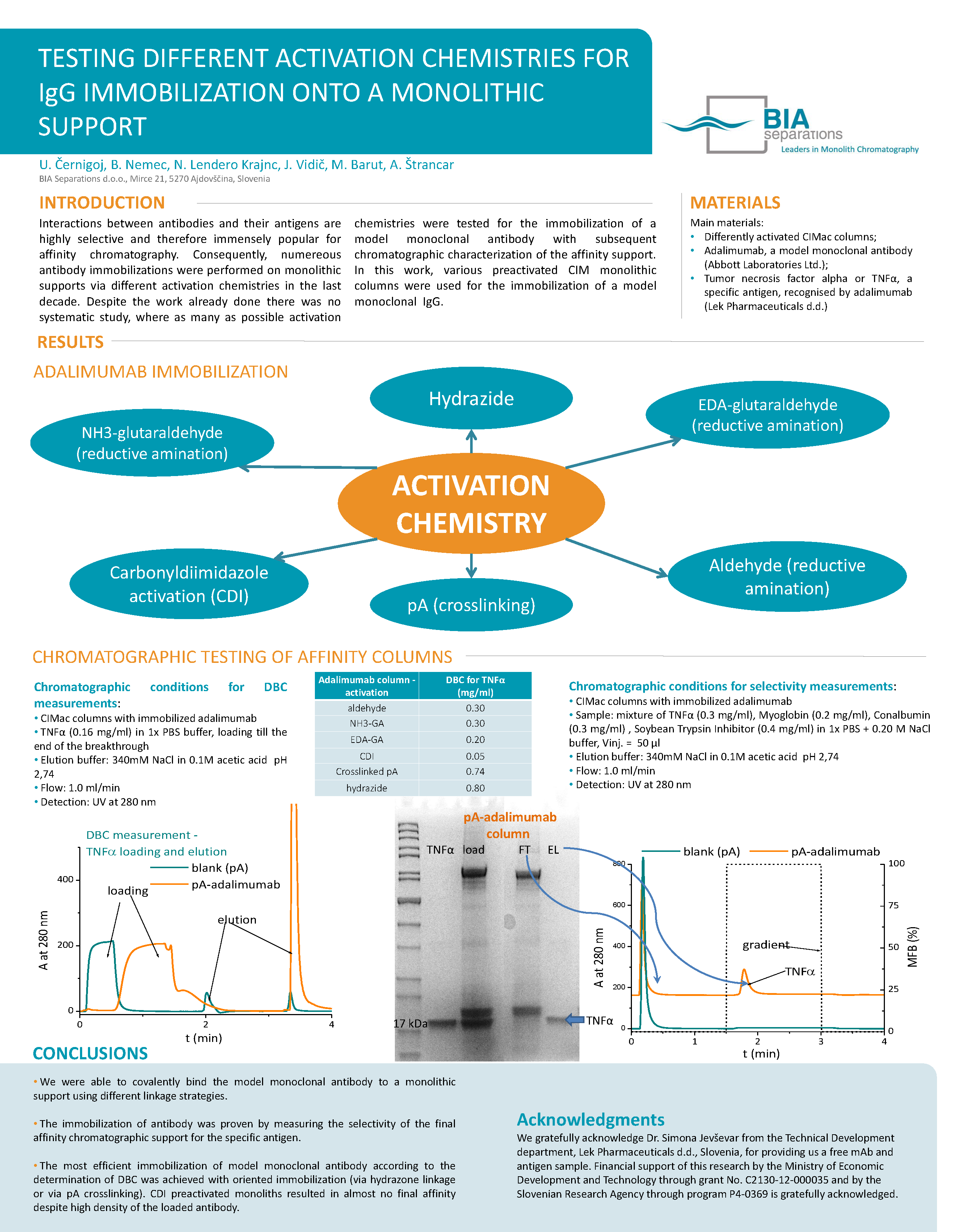 Interactions between antibodies and their antigens are highly selective and therefore immensely popular for affinity chromatography. Consequently, numerous antibody immobilizations were performed on monolithic supports via different activation chemistries in the last decade. Despite the work already done there was no systematic study, where as many as possible activation chemistries were tested for the immobilization of a model monoclonal antibody with subsequent chromatographic characterization of the affinity support. In this work, various pre-activated CIM monolithic columns were used for the immobilization of a model monoclonal IgG.